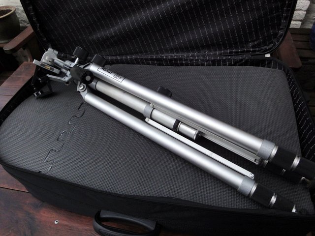 J'ai récemment fait l'acquisition d'une chambre Cambo que j'entendais bien utiliser ailleurs que dans mon jardin. Elle m'a été livrée dans deux valises d'époque (!), aménagées avec des mousses et cloisons, fonctionnelles mais pas pratiques, et nécessitant de trasporter le trépied séparément. (Noter l'auto-collant...) |